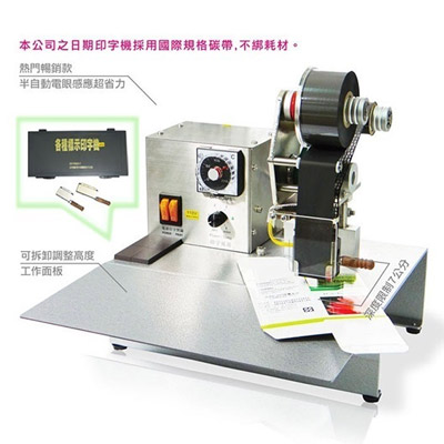 • 整組配件 : 機器1台 + 說明書1本 + 腳踏開關1個 + 碳帶2捲 + 合金字一盒 (可選擇字體大小)